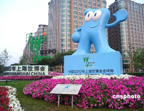 2009年4月28日,上海世博會(huì)吉祥物“海寶”花壇整體亮相北京東單路口處,迎接世博會(huì)倒計(jì)時(shí)一周年的到來(lái),可愛的“海寶”吸引了過(guò)往行人的目光。2010年上海世博會(huì)吉祥物“海寶(HAIBAO)”,意為“四海之寶”,以藍(lán)色漢字的“人”作為核心創(chuàng)意,既反映了中國(guó)文化的特色,又呼應(yīng)了上海世博會(huì)會(huì)徽的設(shè)計(jì)理念。中新社發(fā) 玉龍 攝