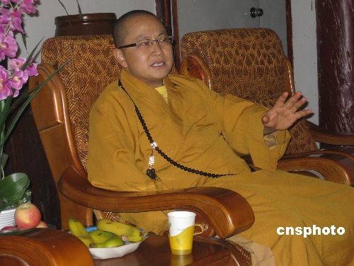 2008年5月12日,四川省地震極重災(zāi)區(qū)什邡市羅漢寺住持素全法師在危難時(shí)刻,將禪房當(dāng)“產(chǎn)房”,先后接納百多個(gè)無(wú)家可歸的產(chǎn)婦,使108個(gè)嬰兒誕生在這片佛門清凈之地,從此什邡羅漢寺108個(gè)“羅漢娃”美名遠(yuǎn)播海內(nèi)外,在中國(guó)佛教史上寫了濃墨重彩的一筆。圖為素全法師接受中新社記者專訪。中新社發(fā) 肖龍聯(lián) 攝