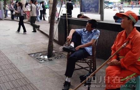 昨日(5日),照片里的主角,宜賓市(四川)翠屏區(qū)市容管理局南城中隊協(xié)管員李劍勇表示,單位領(lǐng)導(dǎo)已批評教育他了,自己影響了宜賓和宜賓城管的形象,他表示非常抱歉!爱(dāng)時所有的攤點(diǎn)都已規(guī)范位置了,想坐著休息下。”李劍勇說,城管協(xié)管員沒有固定工作點(diǎn),他便在游攤最易出現(xiàn)的南門橋頭坐著休息會兒,他希望所有的城管隊員都將他作為反面教材,在以后的工作中注意紀(jì)律和形象。