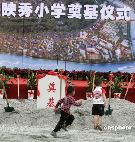 5月11日,四川省汶川縣映秀鎮(zhèn)災后恢復重建項目開工暨映秀小學新校舍奠基儀式舉行。映秀小學在地震中校舍徹底倒塌,孩子們在板房上課至今。新校舍由深圳證監(jiān)局捐建,用地10446平方米,其中綠地面積大于35%,總投資2951.6萬元,擬建6層,可容納12個班,學校運動場作為臨時避災場地。預計工期5個月。 同期開工的還有包括映秀幼兒園、中灘堡大道、漁子溪大橋和映秀鎮(zhèn)安居房等映秀鎮(zhèn)災后恢復重建項目。中新社發(fā) 張曉理 攝