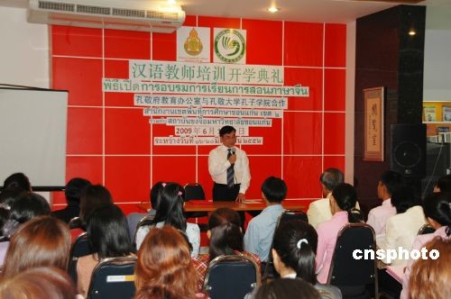 6月16日,泰國孔敬大學(xué)孔子學(xué)院與泰國孔敬府教育辦公室合作舉辦的第六屆漢語教師培訓(xùn)班在泰國開班。這是孔敬大學(xué)孔子學(xué)院和孔敬府教育辦公室在今年的第二次合作,是一次特殊的漢語教師培訓(xùn)。以往的教師培訓(xùn)都是在假期進行,應(yīng)孔敬府教育辦公室對提高教師們的漢語水平的迫切需要,孔子學(xué)院在新學(xué)期剛開始就為孔敬府各區(qū)縣的中小學(xué)教師開設(shè)教師漢語培訓(xùn)課程。來自孔子學(xué)院的領(lǐng)導(dǎo)、老師、志愿者,孔敬府教育辦公室領(lǐng)導(dǎo)及孔敬府各區(qū)縣19所中學(xué)校的40名教師參加了這次開學(xué)典禮。中新社發(fā) 顧時宏 攝