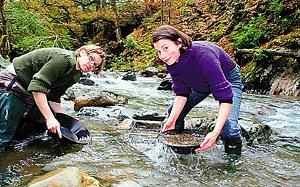黛西便鼓動馬丁跟她一起去淘金, 以打造一對婚戒。說干就干,黛西和馬丁前往威爾士西部重鎮(zhèn)多爾蓋萊,在那里他們找到了一條有含金沙土的河流。在黛西的帶領(lǐng)下,他們在淺水河灘上挖了很多坑,淘出沙土用平底盤仔細篩查。