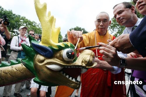 7月23日,美國(guó)紐約香港龍舟節(jié)主辦方在紐約中央公園舉行“點(diǎn)睛醒龍”儀式,宣布第十九屆香港龍舟節(jié)將于8月8日開(kāi)幕,來(lái)自北美各地的一百五十多支隊(duì)伍將進(jìn)行兩天的角逐。主辦方當(dāng)日請(qǐng)來(lái)紐約云門(mén)寺的明予法師念誦經(jīng)文,給船身灑凈,并用毛筆蘸上紅顏料在船頭龍眼上“點(diǎn)睛醒龍”。中新社發(fā) 孫宇挺 攝