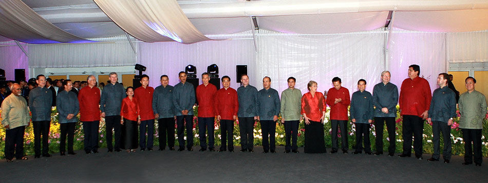 11月14日晚,出席觀看《新加坡之夜》的APEC各成員領(lǐng)導(dǎo)人拍攝了合影,剛剛抵達新加坡的美國總統(tǒng)奧巴馬也參加了合影。 >>點擊此處可看大圖