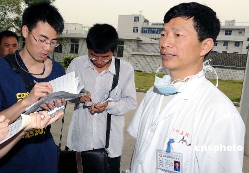 6月1日,福州市肺科醫(yī)院副院長(zhǎng)林鐘軒(右)在接受記者采訪時(shí)表示:福建省第四例甲型H1N1流感患者經(jīng)過治療目前病情有所好轉(zhuǎn)。該患者,男,22歲,美國籍,在美國一企業(yè)工作。5月26日從紐約乘機(jī)經(jīng)溫哥華至香港,在香港轉(zhuǎn)乘KA660航班,北京時(shí)間28日上午抵達(dá)福州長(zhǎng)樂國際機(jī)場(chǎng)。30日上午因發(fā)熱、咳嗽就診連江縣琯頭衛(wèi)生院,測(cè)體溫38.3℃。31日凌晨轉(zhuǎn)至福州肺科醫(yī)院隔離治療,入院測(cè)體溫39.3℃,伴咳嗽、頭痛、咽痛等流感樣癥狀。30日晚上福州市疾病預(yù)防控制中心對(duì)患者鼻咽拭子標(biāo)本進(jìn)行了檢測(cè),結(jié)果為甲型H1N1流感病毒核酸陽性。省衛(wèi)生廳專家組根據(jù)患者的臨床表現(xiàn)、流行病學(xué)史和實(shí)驗(yàn)室檢測(cè)結(jié)果,按照衛(wèi)生部制定的診療方案,判定該病例為甲型H1N1流感確診病例。相關(guān)情況已經(jīng)報(bào)告衛(wèi)生部。中新社發(fā) 劉可耕 攝