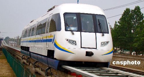 6月15日,中國首列具有完全自主知識產(chǎn)權(quán)的實用型常導(dǎo)中低速磁懸浮列車,在中國北車集團(tuán)唐山軌道客車有限公司下線并完成調(diào)試,開始進(jìn)行線路運行試驗,標(biāo)志著中國已具備中低速磁懸浮列車產(chǎn)業(yè)化的制造能力。該列車為3輛編組模式,車體采用鋁合金與鋁蜂窩鉚焊混合超輕車體結(jié)構(gòu),流線型,全車各部件采用輕型、環(huán)保材料,內(nèi)部裝飾造型簡潔明快、舒適美觀,裝有空調(diào)、影音及廣播系統(tǒng)。運行時速一般在120公里,使用壽命在25年以上。圖為試運行中的中國首列實用型中低速磁懸浮列車。中新社發(fā) 翟羽佳 攝