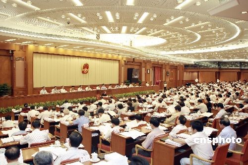 6月22日,十一屆全國(guó)人大常委會(huì)第九次會(huì)議在北京人民大會(huì)堂開(kāi)幕,繼續(xù)審議農(nóng)村土地承包經(jīng)營(yíng)糾紛仲裁法草案、統(tǒng)計(jì)法修訂草案、國(guó)家賠償法修正案草案;首次審議保守國(guó)家秘密法修訂草案、駐外外交人員法草案、海島保護(hù)法草案等。 全國(guó)人大常委會(huì)委員長(zhǎng)吳邦國(guó)主持會(huì)議。中新社發(fā) 盛佳鵬 攝