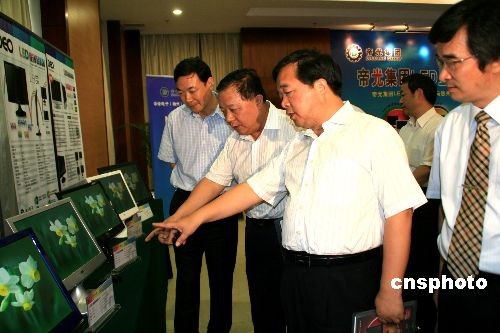 7月20日上午,揚(yáng)州舉行由某集團(tuán)自主研發(fā)的LED顯示終端系列產(chǎn)品發(fā)布會(huì)并現(xiàn)場(chǎng)進(jìn)行展示,凸顯LED終端顯示應(yīng)用產(chǎn)品在健康、節(jié)能、環(huán)保和超薄、時(shí)尚等方面超前的理念。揚(yáng)州市委書(shū)記季建業(yè)、市長(zhǎng)王燕文等出席。季建業(yè)(右二)表示,揚(yáng)州要著力推動(dòng)綠色新能源產(chǎn)業(yè)的技術(shù)向高端突破,產(chǎn)品向終端延伸,推出“五個(gè)一”計(jì)劃,即1000萬(wàn)臺(tái)LED顯示器、1000萬(wàn)臺(tái)LED電視機(jī)、1000萬(wàn)臺(tái)一體化筆記本電腦、1億盞LED燈、1億本E-book。到2012年,新能源、新光源產(chǎn)業(yè)實(shí)現(xiàn)產(chǎn)值“雙千億”。中新社發(fā) 崔佳明 攝