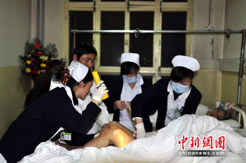 中新網(wǎng)4月16日電 4月16日凌晨2時(shí)10分,第四批青海玉樹縣地震災(zāi)區(qū)傷員抵達(dá)蘭州機(jī)場(chǎng)。至此,蘭州共接收玉樹縣地震災(zāi)區(qū)傷員達(dá)119名,幾乎全部為重癥,被分配到甘肅省人民醫(yī)院、蘭州大學(xué)的附屬醫(yī)院等5家醫(yī)院治療。目前,院方已經(jīng)為傷者開展手術(shù),全力以赴搶救治療。
