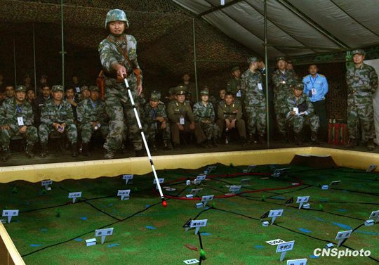解放軍濟(jì)南軍區(qū)“前鋒-2009A”軍事演習(xí)于10月21日17時(shí)在某合同戰(zhàn)術(shù)訓(xùn)練基地打響,這次陸空軍聯(lián)合火力打擊實(shí)兵實(shí)彈演習(xí)將持續(xù)20余個(gè)小時(shí),當(dāng)晚國(guó)防大學(xué)防務(wù)學(xué)院、空軍指揮學(xué)院的外軍學(xué)員,以及英國(guó)、以色列、土耳其、巴基斯坦等國(guó)軍事觀察員親臨現(xiàn)場(chǎng)觀摩了后勤保障戰(zhàn)斗準(zhǔn)備、自行榴彈炮占領(lǐng)陣地、裝甲車輛“摸黑”開進(jìn)等戰(zhàn)斗要素。中新社發(fā) 宋吉河 攝