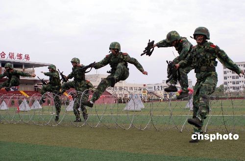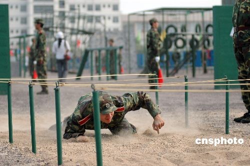 6月13日,山東聊城大學(xué)的441名國防生在校園綜合訓(xùn)練場表演軍體拳、進(jìn)攻戰(zhàn)術(shù)、渡海登島、心理素質(zhì)拓展等綜合素質(zhì)軍事技能,與濟南軍區(qū)簽訂依托培養(yǎng)國防生協(xié)議的山東大學(xué)、中國海洋大學(xué)、中國石油大學(xué)(華東)、山東理工大學(xué)、煙臺大學(xué)的代表及聊城大學(xué)師生進(jìn)行觀摩。中新社發(fā) 張振祥 攝