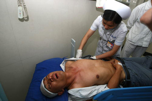 目擊于小龍被執(zhí)法人員毆打的小販林先生告訴記者,突然間4名身穿制服的執(zhí)法人員沖過來沒收東西。于小龍想從執(zhí)法人員手里搶回貨,卻換來一頓暴打!皾M臉都是血!绷窒壬f。記者在南城醫(yī)院看到于小龍?zhí)稍诖采仙胍,頭腦還比較清醒,稱打傷他頭部的是執(zhí)法人員手持的DV機(jī)。