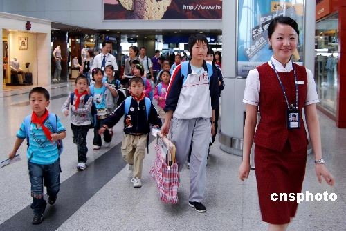 5月14日,來(lái)自四川地震災(zāi)區(qū)綿陽(yáng)、都江堰、彭州等地的20名失去父母的孩子,乘坐飛機(jī)從成都出發(fā)前往北京,15日轉(zhuǎn)機(jī)赴韓國(guó)首爾參訪。15日至19日,他們將出席韓方舉辦的見(jiàn)面會(huì)、交流會(huì)等活動(dòng),參觀學(xué)校、福利院等。圖為服務(wù)員引導(dǎo)孩子們?cè)诔啥嫉菣C(jī)。中新社發(fā) 肖娟 攝