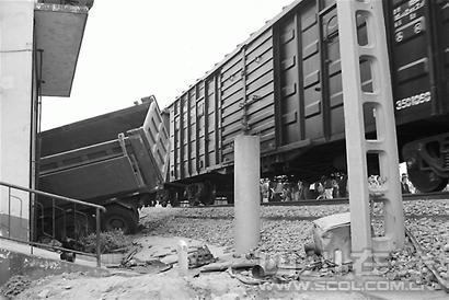 昨(15)日凌晨5時過,一輛出城貨車途經(jīng)金牛區(qū)老沙西線西環(huán)線興盛鐵路道口時,與左邊飛馳而來的火車相撞,貨車駕駛員當(dāng)場死亡。是否由于當(dāng)晚道口值班人員失職,造成道路兩旁的欄桿沒有放下來,成為死者家屬質(zhì)疑的主要焦點。