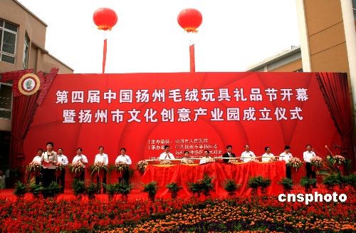 5月18日上午,“第四屆中國揚州毛絨玩具禮品節(jié)在五亭龍國際玩具禮品城開幕,舉行揚州市文化創(chuàng)意產(chǎn)業(yè)園成立、揚州市五亭龍國際玩具精品館開館儀式,同時啟動揚州市文化創(chuàng)意產(chǎn)業(yè)聯(lián)盟。中國禮儀用品工業(yè)協(xié)會副理事長、秘書長曾會師,揚州副市長王玉新,維揚區(qū)委書記姚蘇華等領導和來自海內(nèi)外數(shù)百名玩具采購商參加,開幕式由維揚區(qū)長楊蓉主持。中新社發(fā) 崔佳明 攝