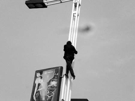 5月16日14時(shí)45分,許昌市(河南)消防支隊(duì)禹州大隊(duì)接到報(bào)警,位于禹州市濱河路東段歐蔓咖啡廳對(duì)面一路燈桿上有人要自殺。消防官兵趕到現(xiàn)場(chǎng)發(fā)現(xiàn),一名約40歲左右,操外地口音的男子在路燈桿頂部,一會(huì)兒躺在路燈桿頂部的燈罩架上做出睡覺(jué)姿勢(shì),一會(huì)兒抓住燈罩架蕩起“秋千”。