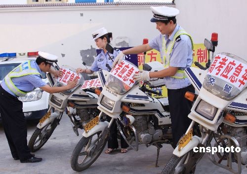 6月4日,安徽淮北交警支隊(duì)在轄區(qū)高考學(xué)校門(mén)前,提前制作了“禁止鳴笛”、“前方道路管制”、“高考應(yīng)急車”等標(biāo)識(shí)標(biāo)牌,并對(duì)高考期間可能出現(xiàn)的突發(fā)事件進(jìn)行演練,以保障高考期間道路暢通,為考生創(chuàng)造一個(gè)良好的考試環(huán)境。中新社發(fā) 張紅心 攝