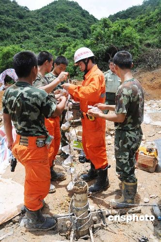 6月7日,發(fā)生塌方事故的三亞繞城高速公路隧道救援工作繼續(xù)緊張有序進行。6月6日12時許,救援人員打通了一條通向被困人員所在處的補給通道,救援人員每隔三個小時左右給被困的8名施工人員進行一次補給。目前,被困人員在隧道內(nèi)有充足的食物和飲用水,情緒穩(wěn)定,耐心等待救援。圖為7日13許,消防官兵通過補給通道給被困8名施工人員進行第8次補給,補給的食物包括雞蛋、火腿腸、牛奶、“紅牛”飲料、小籠包,以及救援時將用到的防毒面具。中新社發(fā) 胡劍兵 攝