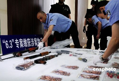 6月15日,重慶市公安局向媒體通報,當(dāng)月3日發(fā)生在重慶主城區(qū)的槍擊案已告破。警方抓獲直接參與持槍殺人的3名罪犯,還通過偵破此案發(fā)現(xiàn)和擴大線索,一舉抓獲50多名涉槍、涉黑和涉惡等犯罪的嫌疑人,繳獲兩支56沖鋒槍、一支唧筒式獵槍、一支德國造PP手槍、一支仿制手槍和一枚手雷、一副手銬及439發(fā)各類子彈。圖為重慶警方在整理繳獲的涉案物品。中新社發(fā) 郭虹 攝