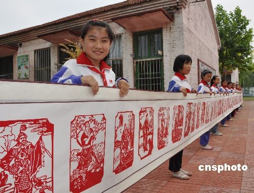 6月17日,在山東博興縣興福鎮(zhèn)村魏小學(xué),歷經(jīng)近兩個月的時間,由該?碳埮d趣小組小學(xué)生集體制作的刻紙作品《水滸一百單八將》全部刻制完成。這幅作品全長38米,寬0.6米,容納進了宋江、林沖、魯智深等梁山好漢108人刻紙像。作品以剪紙與刀工技藝結(jié)合手法,形象表現(xiàn)了我國古代四大名著《水滸傳》中108位“梁山好漢”的個性。中新社發(fā) 陳彬 攝