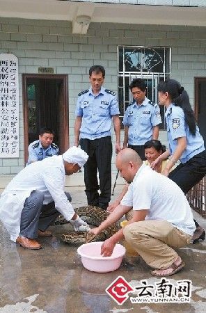 幫巨蟒清洗完身體后,民警當(dāng)場(chǎng)為其體檢:身長(zhǎng)3.7米,腹圍粗為55厘米,重達(dá)25公斤。經(jīng)西雙版納傣族自治州林業(yè)局野生動(dòng)物保護(hù)站獸醫(yī)師許定澤鑒定,這條巨蟒屬于國(guó)家一級(jí)保護(hù)野生動(dòng)物的雌性金花蟒,年齡約20歲左右。根據(jù)蟒蛇約35歲左右的壽命推算,其應(yīng)該正處于盛年期。據(jù)許定澤介紹,這樣大的金花蟒,實(shí)屬罕見(jiàn)。(戴振華 常宗波)