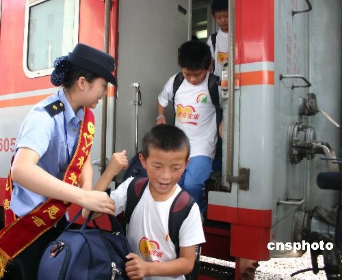 6月20日16時25分,由鐵道部特批的“日照-成都”愛心專列安全駛?cè)氤啥寄险尽?22名在山東日照“安康家園”學習生活的地震災區(qū)孩子,在離開四川家鄉(xiāng)一年后,重新踏上家鄉(xiāng)的土地,即將開啟他們新的生活。去年6月,在全國婦聯(lián)、中國兒童少年基金會的安排下,來自四川省10個市、州的共720名災區(qū)娃娃,分22批陸續(xù)安排到山東日照市生活、學習。其中有522四川地震災區(qū)的娃娃(其中338名地震孤兒)前往山東日照市“安康家園”學習生活,日照鋼鐵集團拿出192套新建職工住房建起“日照安康家園”,配備了120多位專職“安康媽媽”,同時建起食堂、醫(yī)務室、電子閱覽室等,創(chuàng)造了全國災區(qū)娃娃安置中最大的“家”。中新社發(fā) 霍潺 攝