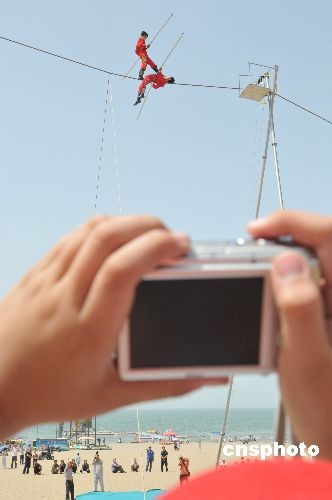 6月20日,“達(dá)瓦孜”表演者向外地游客展示了維吾爾族民間傳統(tǒng)絕技“達(dá)瓦孜”的風(fēng)采。當(dāng)天,為期10天的新疆巴州和碩縣金沙灘“達(dá)瓦孜”表演拉開序幕。