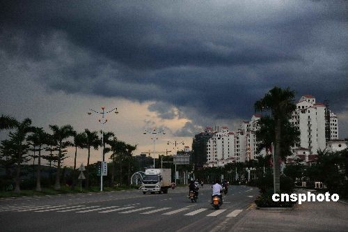 2009年6月25日,海南東部瓊海市上空烏云翻滾。今年第四號(hào)熱帶風(fēng)暴“浪卡”目前正在中沙群島偏東方約350公里的南海東部海面上,中心附近最大風(fēng)力8級(jí),預(yù)計(jì)未來(lái)24小時(shí)內(nèi),“浪卡”中心以15公里左右的時(shí)速向西北方向移動(dòng),強(qiáng)度將有所加強(qiáng)。 中新社發(fā) 蒙鐘德 攝