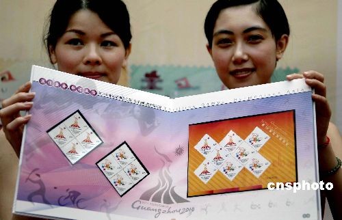 6月30日,在廣州亞運會倒計時500天之際,由第16屆亞運會組委會授權(quán)、中國郵政發(fā)行的廣州亞運會首套紀念郵票《第16屆亞洲運動會》在廣州舉行首發(fā)儀式。該套紀念郵票共兩枚,圖案分別為廣州亞運會的會徽和吉祥物,采用五色影寫版印刷方式,由中國著名郵票設(shè)計家方軍設(shè)計,畫面將嶺南文化元素與亞運元素融為一體,具濃郁嶺南氣息。中新社發(fā) 劉衛(wèi)勇 攝
