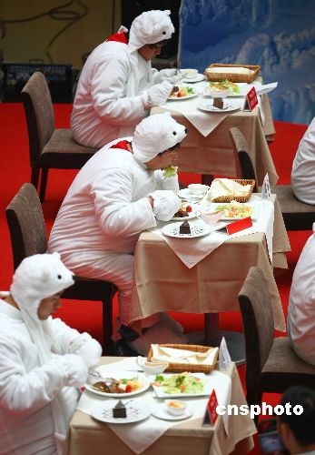 7月4日,一項關(guān)注全球變暖的時尚環(huán)保比賽在北京一購物中心舉行,比賽者身披厚厚的毛皮、頭戴北極熊頭套,在千瓦鎢絲燈光的烤射下,比賽吃西式牛排套餐;顒又荚诔珜(dǎo)都市潮人們在享受時尚浪漫生活的同時,不忘“環(huán)保、減碳、愛地球”,關(guān)注“地球均溫如升高6度,冰川融化,不只北極熊將失去家園,地球也將面臨毀滅”的現(xiàn)實話題。中新社發(fā) 富田 攝