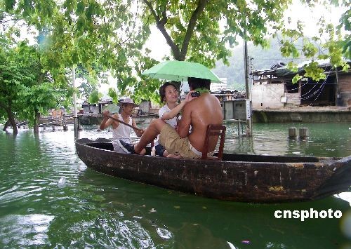 7月6日,受廣西上游普降暴雨影響,西江廣東境內(nèi)封開縣江口水位急速上漲,到下午4時(shí)止,封開縣城江口水位達(dá)到19.32米,超出警戒線2.2米,西江水已淹入江口鎮(zhèn)部分地區(qū),并仍以6厘米/小時(shí)的速度上漲,肇慶高要水文站稱,預(yù)計(jì)7日傍晚將迎來今年西江首個(gè)洪峰,西江水位將超過9米。目前西江肇慶段沿線正嚴(yán)陣以待備戰(zhàn)洪災(zāi)。中新社發(fā) 黃耀輝 攝