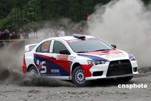 6月14日,2009年全國(guó)汽車(chē)?yán)﹀\標(biāo)賽(CRC)“湯山溫泉杯”南京江寧拉力賽進(jìn)入最后一天的爭(zhēng)奪,代表廣西速1車(chē)隊(duì)參賽的臺(tái)灣影視明星林志穎發(fā)揮穩(wěn)定,目前列在國(guó)際組國(guó)內(nèi)車(chē)手的第七名,很有機(jī)會(huì)沖擊獎(jiǎng)杯,為車(chē)隊(duì)帶來(lái)更高的榮譽(yù)。中新社發(fā) 趙振清 攝