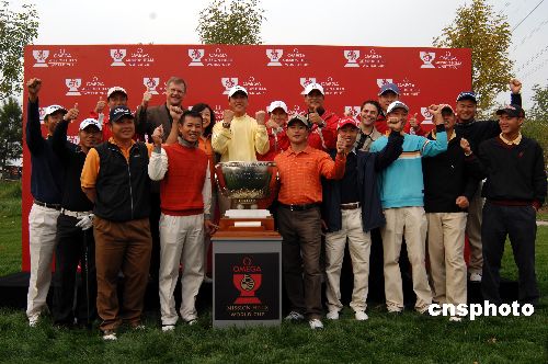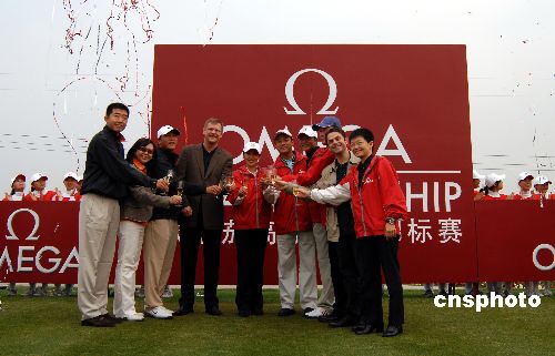2007歐米茄中國巡回賽年度收官之站——歐米茄高爾夫球錦標(biāo)賽于10月18日至21日在北京天安假日運(yùn)動(dòng)俱樂部舉行,本站賽事獎(jiǎng)金總額80萬人民。10月17日,國家體育總局小球中心副主任王立偉、歐米茄大中華區(qū)總裁盧克勤、歐米茄名人大使楊揚(yáng)、任達(dá)華,天安假日運(yùn)動(dòng)俱樂部董事程軍、歐米茄中國巡回賽球員張連偉共同出席開球儀式。中新社發(fā) 楊可佳 攝