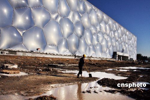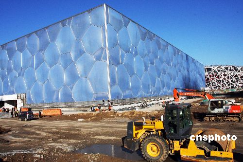 10月28日,北京國家游泳中心“水立方”工地,工人們正在緊張施工。據(jù)了解,陽光下呈淡藍色的國家游泳中心“水立方”目前總體工程建設(shè)進展順利,并將于2007年年底全部完工。中新社發(fā) 鄭雄增 攝
