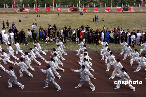 11月2日,湖南漣鋼離退休老職工參加千人太極拳表演。據(jù)悉,該集團(tuán)為宣傳奧運(yùn)會(huì)精神,開(kāi)展“與奧運(yùn)同行,與健康同行”千人太極拳表演活動(dòng)。中新社發(fā) 郭國(guó)權(quán) 攝