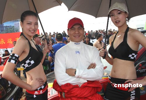 2007年國際汽聯(lián)亞太汽車?yán)﹀\標(biāo)賽11月9日在浙江龍游拉開戰(zhàn)幕,來自世界的眾多高手及中國的共計65部賽車參賽。圖為“中國第一車手”徐浪(中)新組建的“無名車隊”由美女相伴出戰(zhàn)。中新社發(fā) 趙振清 攝