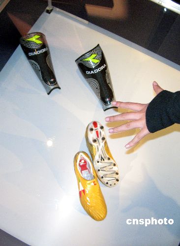 十一月十日,“2007米蘭設(shè)計(jì)制造展”在上海開幕,為意大利贏取2015年世博會(huì)主辦權(quán)造勢(shì)。意大利球星托蒂的“世界杯紀(jì)念球鞋”及蘊(yùn)涵高科技的球員“護(hù)脛”隨這一展覽首次亮相上海。據(jù)介紹,這雙金色的足球鞋,是典型的米蘭設(shè)計(jì)風(fēng)格,使用金色袋鼠皮配合意大利國旗的三色標(biāo)志,鞋跟部的四顆星,象征意大利國家隊(duì)四度贏得問鼎世界杯。中新社發(fā) 許曉青 攝