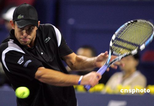 11月12日,在2007上海網(wǎng)球大師杯賽紅組首場(chǎng)單打比賽中,美國(guó)“火箭小子”羅迪克戰(zhàn)勝世界排名第4的俄羅斯選手達(dá)維登科,迎來本屆大師杯開門紅。中新社發(fā) 湯彥俊 攝