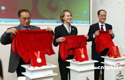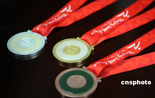 十一月十四日,北京奧組委發(fā)布2008年殘奧會(huì)獎(jiǎng)牌式樣,其設(shè)計(jì)創(chuàng)意、造型與北京奧運(yùn)會(huì)獎(jiǎng)牌一脈相承,體現(xiàn)了“兩個(gè)奧運(yùn) 同樣精彩”的要求。殘奧會(huì)獎(jiǎng)牌正面鑲玉的設(shè)計(jì)靈感來自中國古代的玉器造型,中間為北京2008年殘奧會(huì)會(huì)徽;玉的色澤隨金、銀、銅牌有所變化,分別為白玉、青白玉、青玉。中新社發(fā) 任海霞 攝