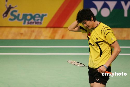 十一月二十九日,二零零七中國(guó)香港羽毛球超級(jí)賽進(jìn)行正賽第二輪的比賽,男單三號(hào)種子選手鮑春來因?yàn)橛夷_腳踝有傷宣布放棄比賽。中新社發(fā) 武仲林 攝