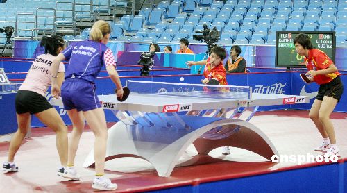 12月18日,奧運(yùn)測試賽乒乓球女團(tuán)比賽揭幕。第三場進(jìn)行的是雙打比賽,中國隊(duì)派出郭躍/李曉霞這對(duì)雙打組合,而歐洲聯(lián)隊(duì)一方則是鮑羅斯和孫禎琦的組合,雖然首局在拿到局點(diǎn)的情況下被對(duì)手以12比10逆轉(zhuǎn),但郭躍和李曉霞調(diào)整心態(tài)的速度非常快,她們以11比7,11比5和11比2連下三局,以3比1戰(zhàn)勝鮑羅斯/孫禎琦,從而使得中國女隊(duì)以3比0輕取歐洲聯(lián)隊(duì),取得本次邀請(qǐng)賽的開門紅。中新社發(fā) 博芽影像 攝