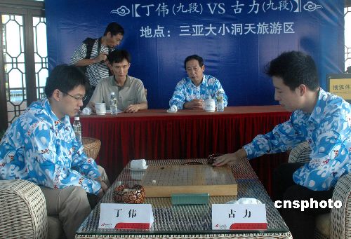 十二月十八日,第二十屆中國(guó)圍棋名人戰(zhàn)決賽在海南省三亞市大小洞天旅游區(qū)拉開(kāi)序幕,由丁偉九段挑戰(zhàn)上屆冠軍古力九段。在首輪比賽中,古力執(zhí)黑以一又四分之三子戰(zhàn)勝丁偉,在五番棋中拔得頭籌。雙方第二輪比賽將于二十日在同一地點(diǎn)進(jìn)行。圖為雙方在比賽中。中新社發(fā) 尹海明 攝