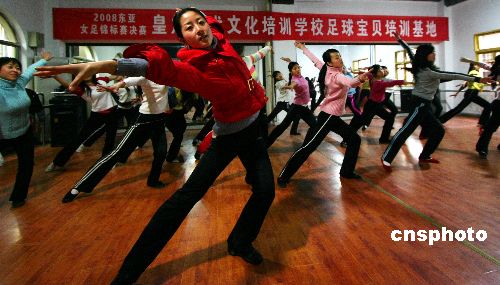 1月15日,東亞女足的“足球?qū)氊悺眰冊谟柧殹?008年東亞女足錦標賽將于2月17日-24日在重慶市永川區(qū)體育中心舉行,永川區(qū)從該區(qū)大中院校選出42名“足球?qū)氊悺,進行為期一個月的藝術(shù)體操、姿態(tài)等基本功訓練,屆時將以嶄新身姿展現(xiàn)在人們面前。中新社發(fā) 陳仕川 攝