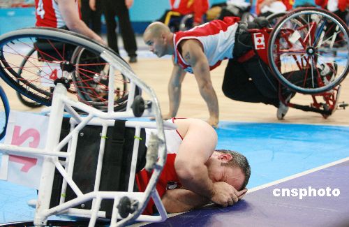 1月22日,“好運北京”2008年國際輪椅籃球邀請賽在北京國家體育館繼續(xù)進行,在男子組最后一輪比賽中,雅典殘奧會冠軍加拿大隊以69比47戰(zhàn)勝中國隊。三輪循環(huán)賽過后,加拿大隊2勝1負很可能獲得預賽第二名,中國隊三戰(zhàn)皆負排名第四。圖為比賽中加拿大隊兩名隊員由于拼搶激烈摔倒在球場上。中新社發(fā) 廖文靜 攝