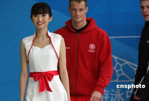 2月1日,“好運北京”中國游泳公開賽舉行六個項目的決賽,以大學生為主的頒獎禮儀小姐為備戰(zhàn)北京奧運會現(xiàn)場熱身。中新社發(fā) 任晨鳴 攝