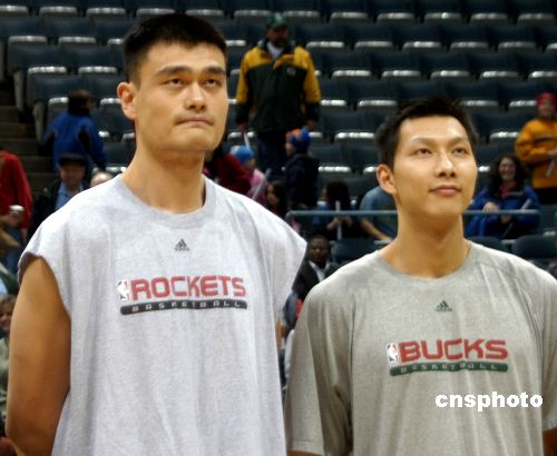 當(dāng)?shù)貢r間二月二日,由姚明領(lǐng)軍的NBA休斯頓火箭隊作客密爾沃基,挑戰(zhàn)另一位中國球員易建聯(lián)所效力的雄鹿隊。此為火箭和雄鹿在本賽季的第二次交鋒。姚明(左)和易建聯(lián)(右)賽前互致問候并合影。中新社發(fā) 李靜 攝