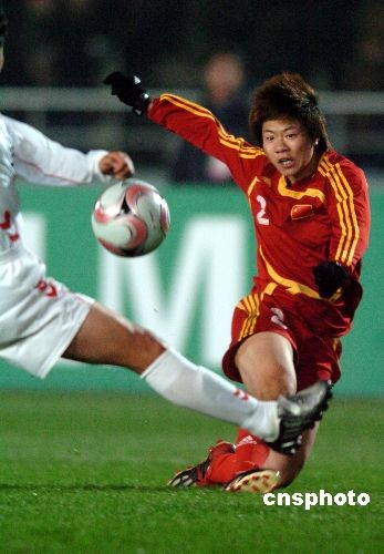 2008年2月21日晚,東亞女子足球錦標(biāo)賽第二輪在重慶永川體育中心體育場進(jìn)行。終場中國隊在少一人的情況下以0比0戰(zhàn)平朝鮮隊。中新社發(fā) 吳峻 攝