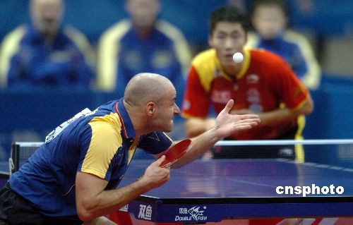 2月25日晚,第49屆世乒賽團體賽進入第二天的爭奪,中國男隊迎戰(zhàn)小組賽中的羅馬尼亞隊。王勵勤在首場比賽中以1比3負于世界排名97位的菲利蒙。中國隊出場的另外兩運動員陳玘和王皓分別戰(zhàn)勝對手,最終中國隊3比1勝羅馬尼亞隊。中新社發(fā) 吳峻 攝