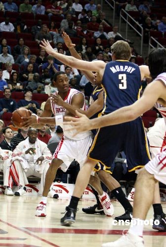 當(dāng)?shù)貢r(shí)間3月5日晚,休斯敦火箭隊(duì)坐鎮(zhèn)主場,在缺少姚明的情況下,以117比99大勝印地安那步行者隊(duì)豪取16連勝,刷新了球隊(duì)41年歷史上的最長連勝紀(jì)錄。圖為火箭靈魂人物麥迪帶球突破。中新社發(fā) 楊晉升 攝