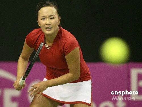 4月26日,聯(lián)合會(huì)杯網(wǎng)球賽世界杯半決賽中國隊(duì)與西班牙隊(duì)的比賽在北京國際網(wǎng)球中心進(jìn)行。在首場單打比賽中,彭帥連輸兩盤以3-6,6(4)-7不敵年僅19歲的西班牙小將納瓦羅?偙确种袊0比1暫時(shí)落后。中新社發(fā) 富田 攝